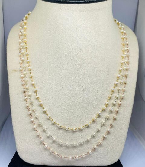 This necklace features three beautifully arranged strands of pearls, each layer cascading gently to create a balanced and elegant silhouette. The layered structure adds depth and visual richness while maintaining a lightweight and graceful appearance. The uniform spacing of the pearls ensures symmetry and refinement, making the necklace visually pleasing from every angle.
